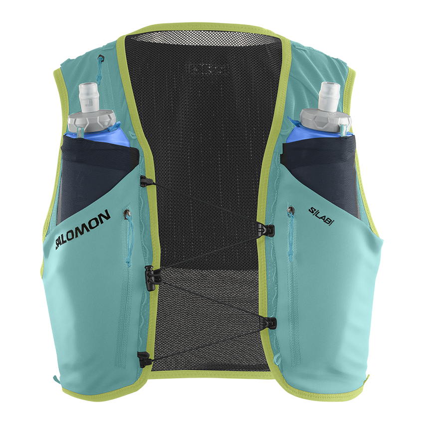 POCKETS & COMPARTMENTS - 2 front flask pockets: Designed to fit Salomon soft flasks, these front pockets limit bouncing. Top elastic loops secure your flasks and keep them ready to drink.